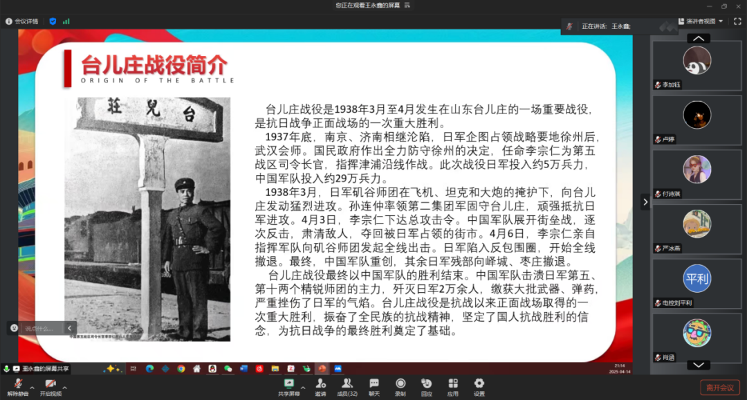 为弘扬爱国主义精神,扎实推进党史学习教育,铭记艰苦卓绝的历史。3月10日晚,电控学院卓越本科生党支部举行了“烽火印记·卓越传承”革命主题故事分享活动,集中观看红色影片《血战台儿庄》。