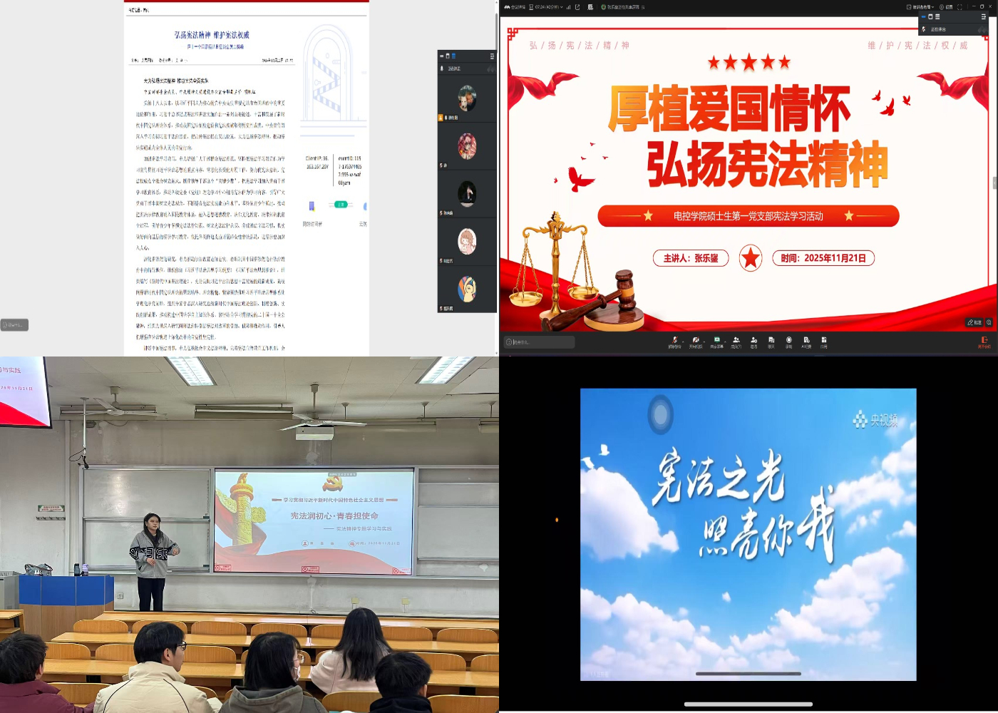 为深入学习贯彻习近平法治思想,弘扬宪法精神,引导学生党员厚植爱国情怀、担当时代重任,近日,电控学院学生党支部开展了“学习宪法精神,担当时代重任”系列主题党日活动。各支部通过领学解读、观影研讨、晨读宪法等多种形式,教育引导广大学生党员深刻领会宪法要义,以奋发有为的姿态投身“十五五”建设,为法治中国建设贡献青春力量。