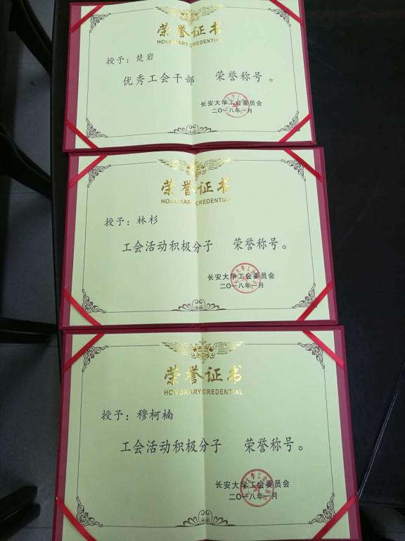 日前,校工会下发文件,为校级优秀工会干部、工会活动积极分子颁发荣誉证书,表彰在2017年度我校工会工作中表现突出的先进个人。我院楚岩老师获得2017年度优秀工会干部,穆柯楠及林杉老师获得工会活动积极分子。