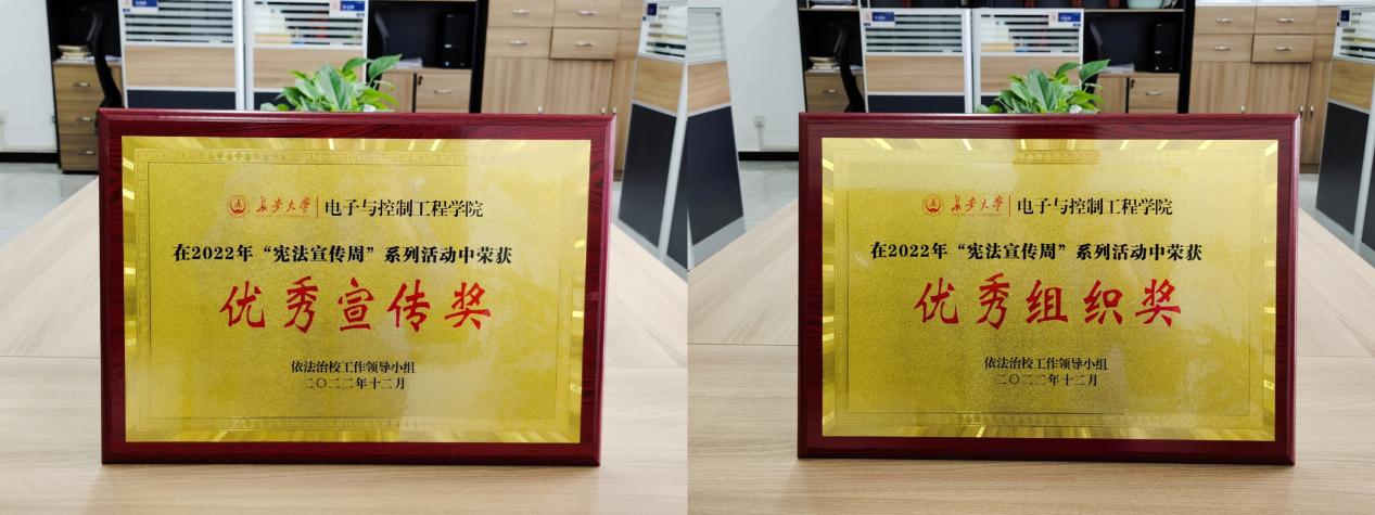 近日,长安大学依法治校领导小组评选公布了学校2022年“宪法宣传周”系列活动获奖名单,电控学院荣获“优秀宣传奖”和“优秀组织奖”,本科生曹智勇、刘书霞荣获宪法知识竞赛“优胜者”。