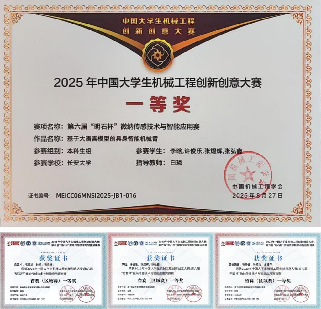 8月25日至8月27日,由中国机械工程协会主办的第六届“明石杯”微纳传感技术与智能应用赛全国总决赛在山东烟台举行,我院荣获全国一等奖1项、陕西省一等奖3项。本次比赛共吸引来自全国各高校369项各赛区一等奖作品参加,参赛人数及规模又创新高。我院本次参赛人数及获奖级别、获奖数量均取得历史性突破。
